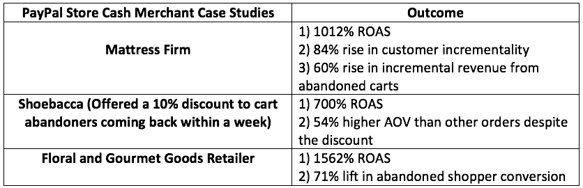 For example, PayPal Store Cash is a program that identifies “almost-buyers” or those who started, but didn’t finish the checkout process from its a database of 392 million+ shoppers. Merchants get a curated list of these relevant and interested consumers to re-target with promotions to lure them back in. To boost accessibility for smaller merchants, PayPal solely charges for access to this service on a performance fee basis. It takes 8% of incremental sales generated from the merchant which nurtures some stellar return on ad spend (ROAS) metrics.