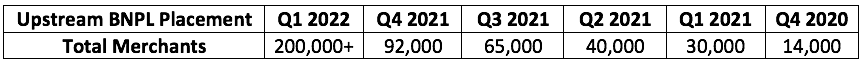 This not an isolated incident but a bit of a cliché -- and a heartening one at that for PayPal. Omaha Steaks saw a 10% spike in AOV by implementing Pay Later upstream and saw its overall customer base become materially younger. That was something it had struggled with for years. Unsurprisingly, these trends have paved the way for rapid merchant upstream placement progress: