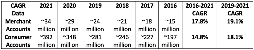 PayPal’s risk management and checkout flow edges yield that aforementioned 6% higher authorization rate for merchants vs. industry standards without impacting loss or fraud rates. That advantage -- which is up from 4% as of 2020 -- means that merchants convert 6 more transactions per 100, while consumers are rejected and thus discouraged less frequently. This quarter, CEO Dan Schulman hinted that the lead is now closer to 8%. Regardless of which metric is accurate, it’s a massive impact. Again, PayPal provides the coveted holy grail in online payment: More approvals and lower loss rates.