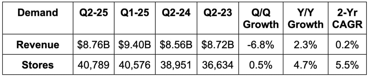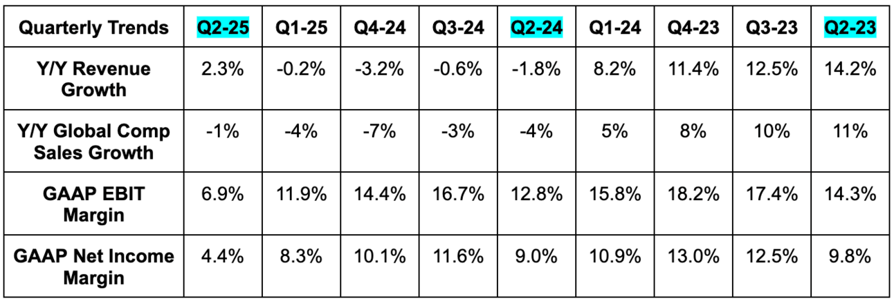 - Missed comparable store sales estimates of 0.5% with -1% Y/Y growth. China and International beat estimates; the USA missed slightly.