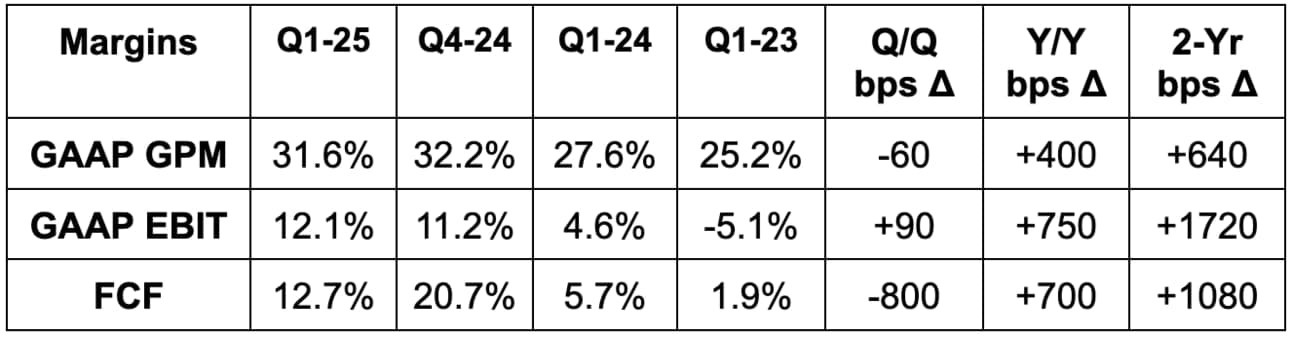 - Beat 31.5% GPM estimates & identical guidance by 10 basis points (bps; 1 basis point = 0.01%) each.