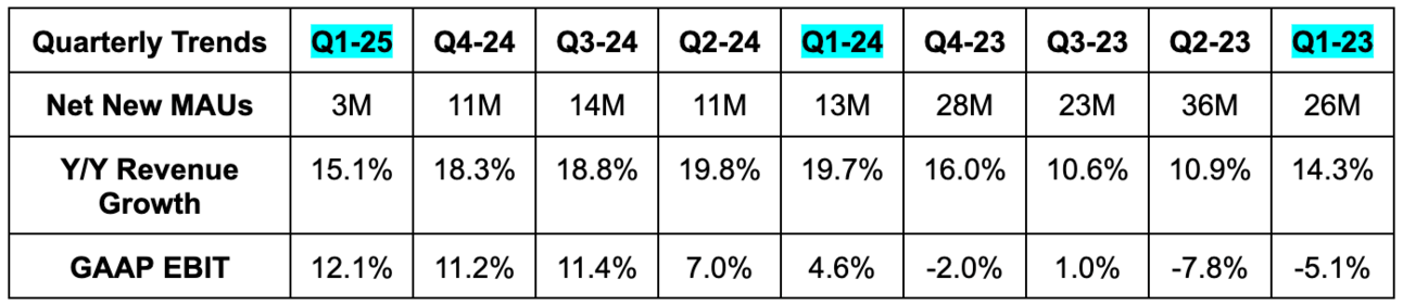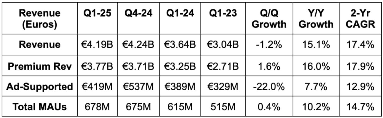 - Met total monthly active user (MAU) guidance; beat premium subscriber guidance by 1.1%.