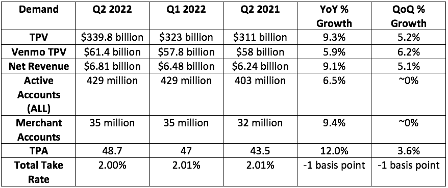 - PayPal added 400,000 net accounts this quarter. This was all thanks to Venmo as PayPal let many low engagement accounts roll-off. 0% YoY account growth shown above is a matter of rounding