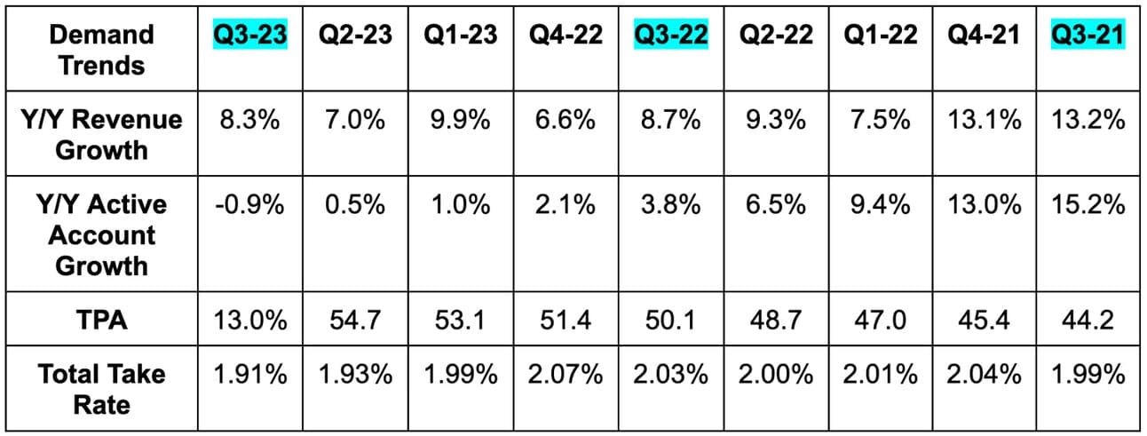 For the full year, it lowered its revenue growth guidance from 8% to 7.5% and lowered FXN growth guidance from 9.5% to 8.5%. It lowered its EBIT margin expansion guidance from 100 bps Y/Y to 75 bps Y/Y. This is due to branded checkout slowing starting in July and through the end of Q3. Imperatively, that slowing stabilized quarter to date with growth in line with the first half of the year. That’s slightly worse than what we were told to expect on the last call. The guidance was called very prudent.