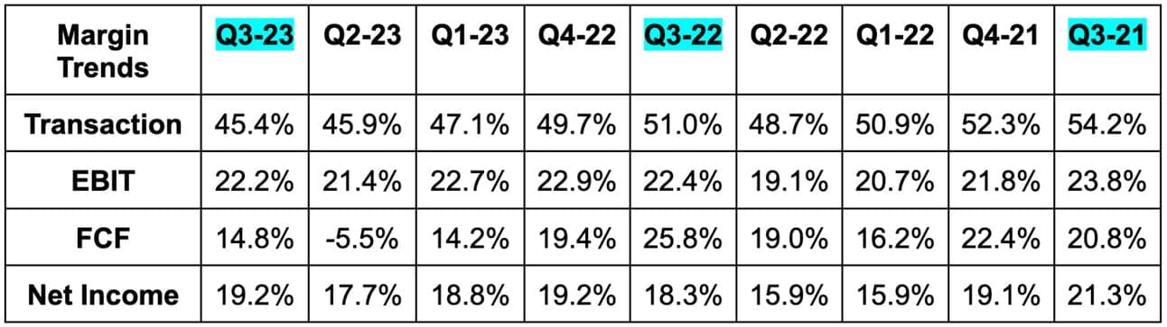 Finally, for transaction dollars, the Q4 Y/Y decline will improve vs. Q3. This means better than -3% Y/Y transaction dollar growth. The margin will again contract Y/Y in Q4. Q4 is expected to represent a transaction dollar growth bottom with that turning positive (along with a resumption of margin expansion) in 2024. This is vital.