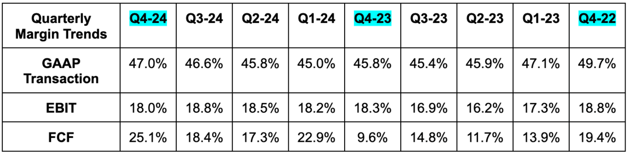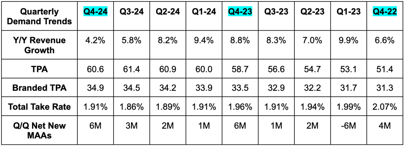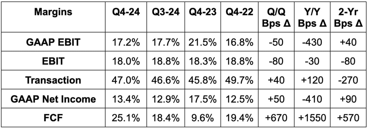 - Non-transaction OpEx rose by 10% Y/Y, as it deferred a lot of 2024 marketing expenses to Q4.