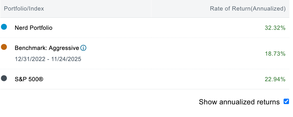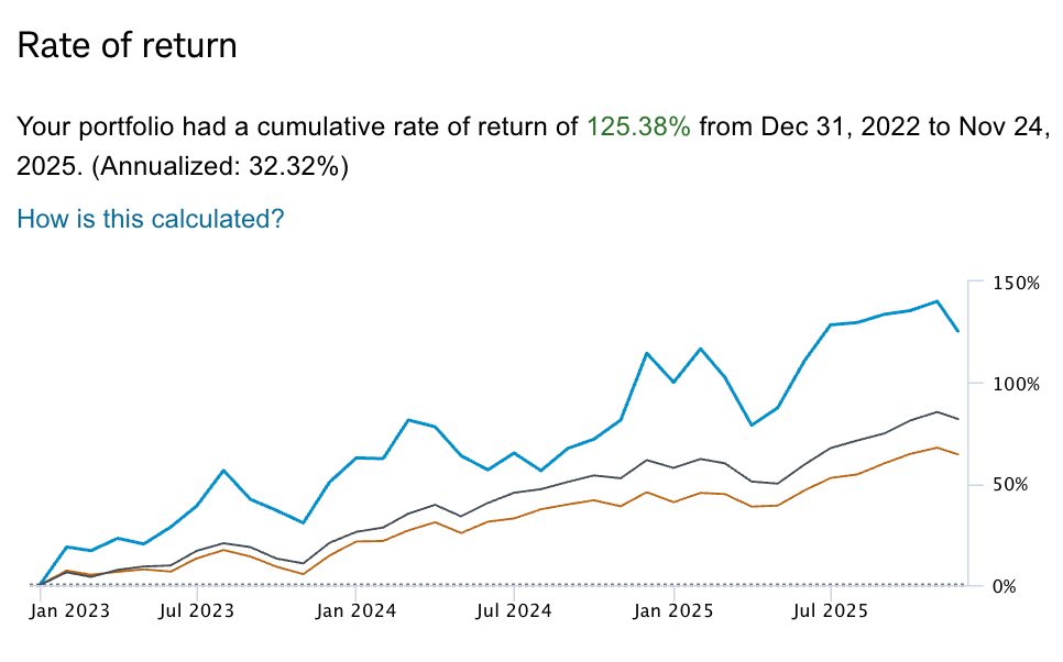 Portfolio Change & Performance Update Bradley Freeman Nov 25, 2025 2 min read Table of Contentsa. Performance Updateb. Portfolio Changec. Holdings a. Performance UpdateOverall: