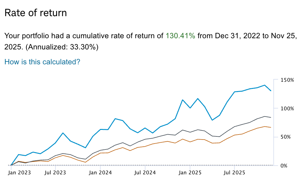 Portfolio & Performance Updates Bradley Freeman Nov 26, 2025 1 min read a. Updated Performance vs. the S&P 500Overall:
