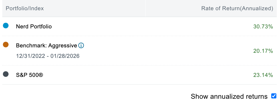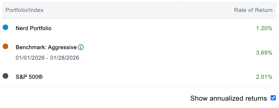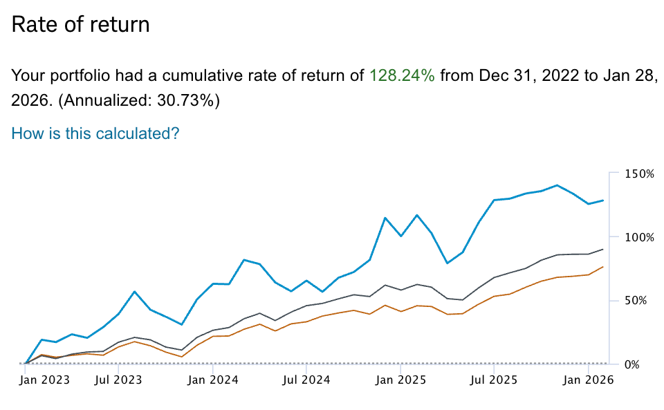 Photo by ian dooley / Unsplash Portfolio & Performance Updates 29 January 2026 2 min read Table of Contentsa. Updated Performanceb. Portfolio Changesc. Portfolio Management Strategyd. Updated Holdings a. Updated PerformanceOverall:Year-to-date:b. Portfolio Changes