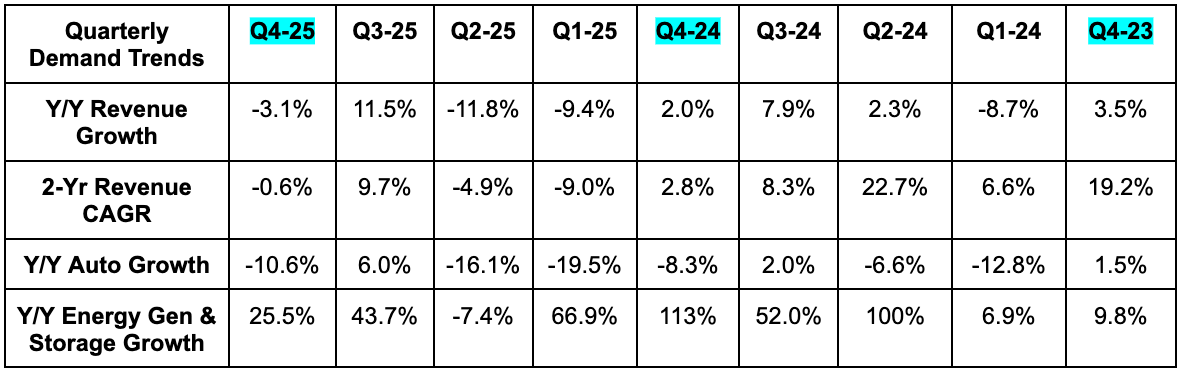 Auto revenue missed by 8%, while the rest of its smaller segments sharply beat expectations to offset that weakness. Last quarter, Tesla discussed that the end of EV incentives created a rush to purchase Tesla vehicles, which accelerated demand for the period. That led to tougher growth comps, but the Y/Y growth comp overall got 6 points easier and they still slowed by another 5 points. In terms of stronger pockets of demand, deliveries set new highs in smaller emerging markets like Saudi Arabia, Taiwan and Poland. Musk said Asia-Pacific (APAC) and EU demand was strong, but it is worth noting that Tesla did not include the market share chart it usually does in its earnings presentation.