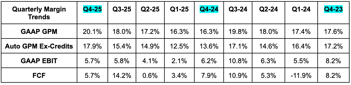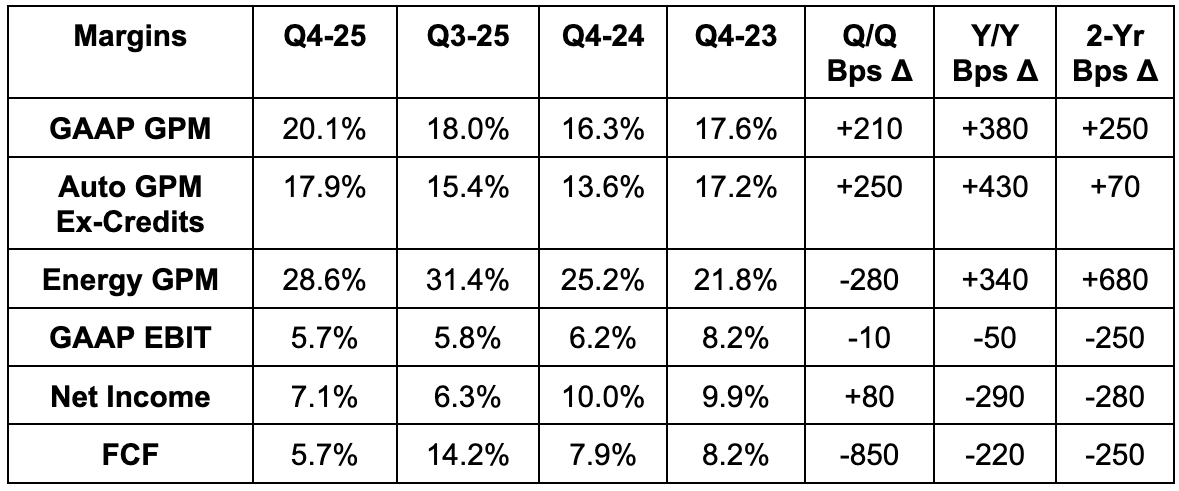 - Beat 17% GPM estimates by 3 points and beat 14% auto GPM ex-credits margin estimates by 4 points.