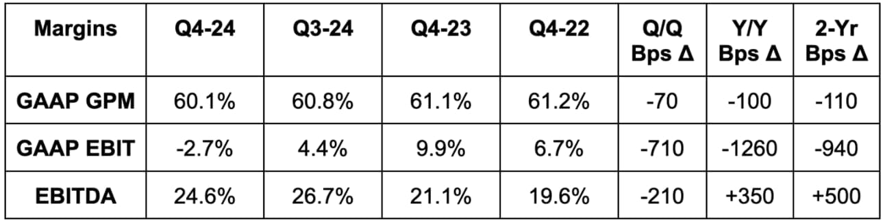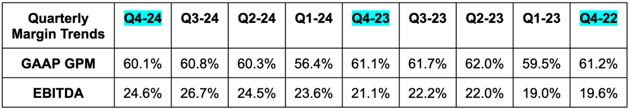 - Beat 72% GPM estimates by 120 bps (chart below is GAAP GPM).