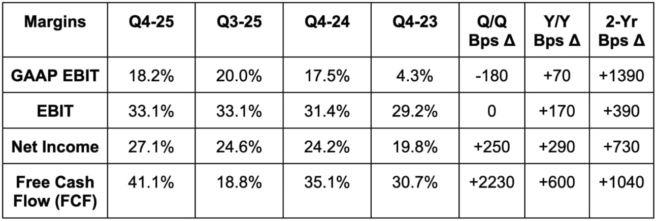 - Diluted share count fell by 1% Y/Y.