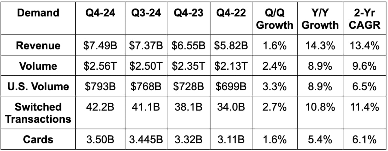 So far this quarter, U.S. payments volume has accelerated from 7% to 8% Y/Y growth. This acceleration is coming from debit not credit, which not only bodes well for the economy, but for consumer balance sheets as well. When pairing this with credit repayment data from J.P Morgan, Bank of America, American Express and several others, economic and consumer health continues to be resilient in the USA. You’ll see that Mastercard said the same thing in a moment. Furthermore, U.S. consumer holiday spending saw some of its best traction with discretionary categories, showing the disposable income levels may be improving.