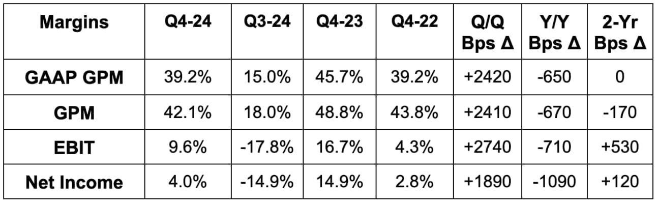 Revenue guidance missed by 5%; gross margin guidance missed by 300 bps; EPS guidance missed $0.08 estimates by $0.08. It also expects a 33.8% GAAP GPM and -$0.27 in GAAP EPS next quarter.