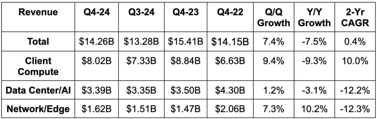 - Beat revenue estimates by 3.2%; Client compute beat by 2.3%; Data Center & AI slightly beat; Network and Edge beat by 8%; Foundry slightly beat.