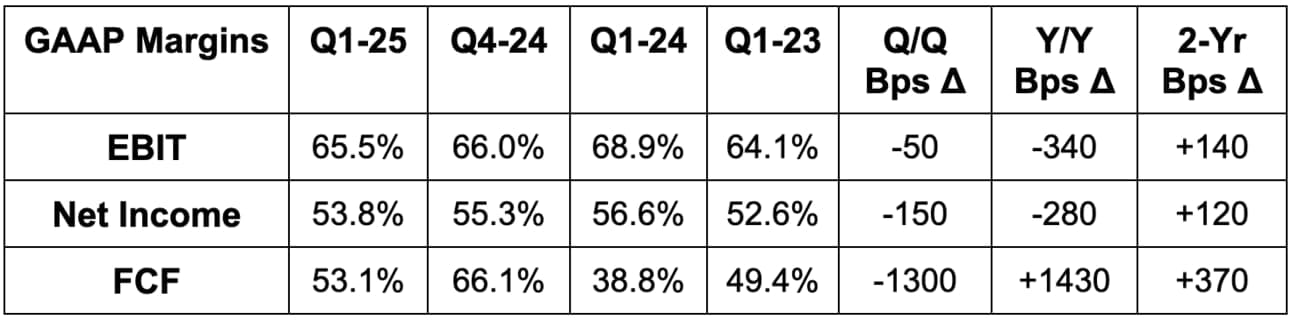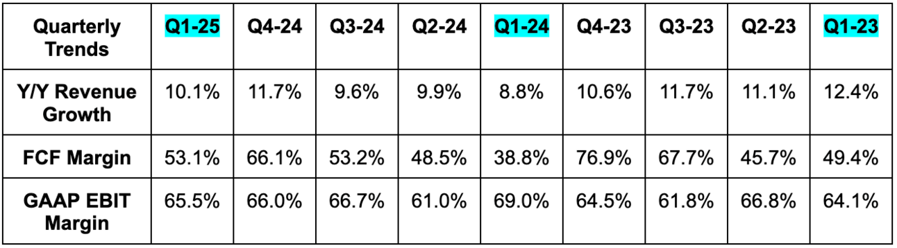 - Beat EBIT estimates by 1%; met OpEx growth guidance. GAAP OpEx was above expectations, largely due to its “Recorded Future” acquisition closing a quarter early. This means there will be a full year of impact on expenses.