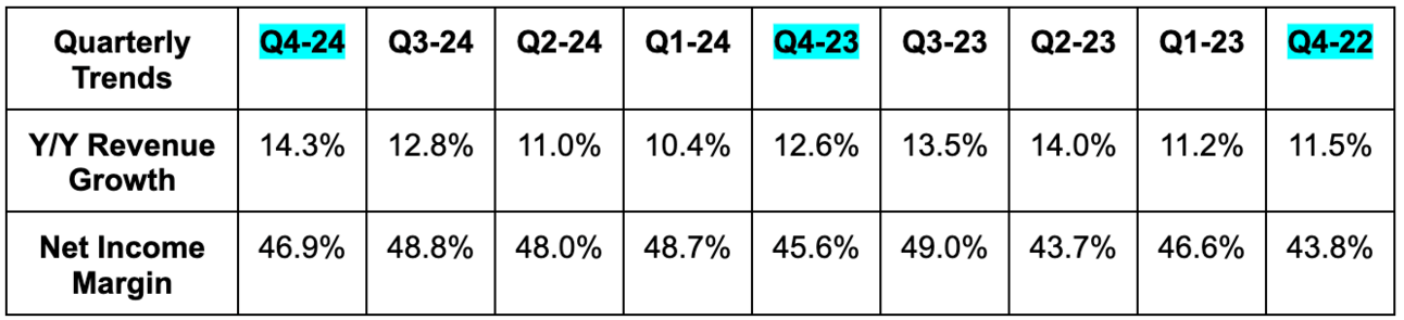 - Beat revenue estimates by 1.5% & came in at the high end of low-teens revenue growth guidance.