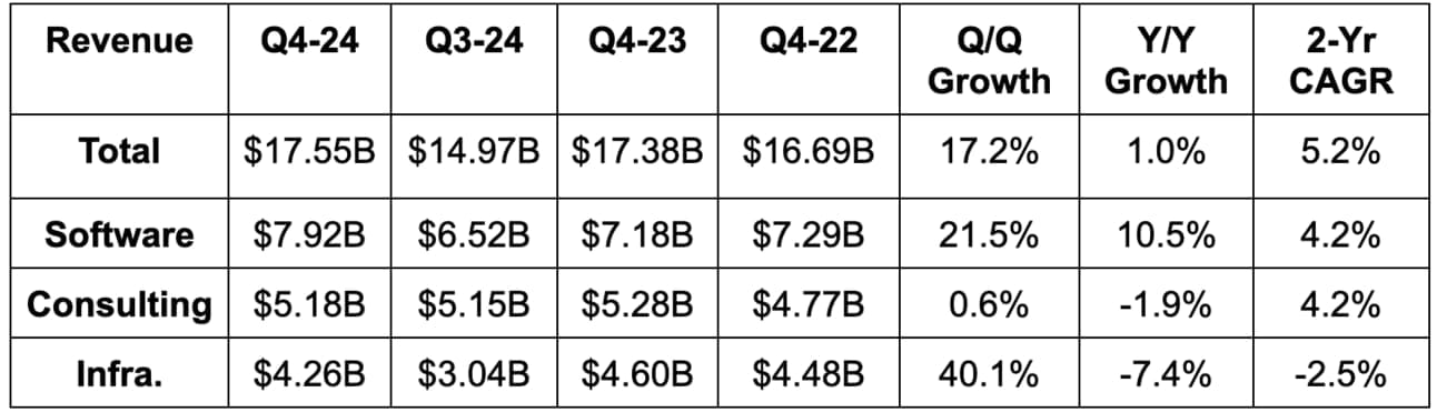 - IBM missed 1.5% Y/Y growth guidance but met 2% Y/Y FXN growth guidance. It very slightly beat revenue estimates.