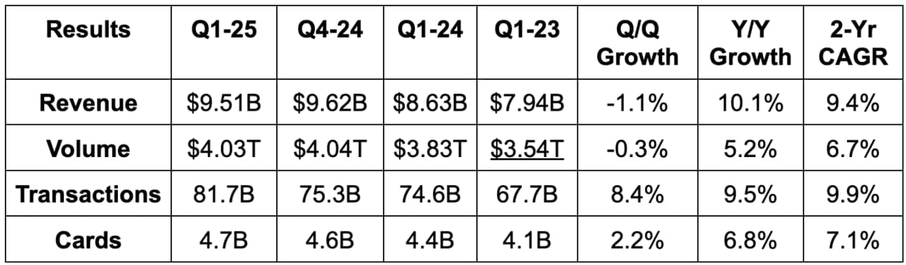 - Consumer credit volume rose 5% Y/Y; consumer debit volume rose 8% Y/Y; commercial volume rose 4% Y/Y; cash volume fell 1% Y/Y; total volume rose 5% Y/Y.