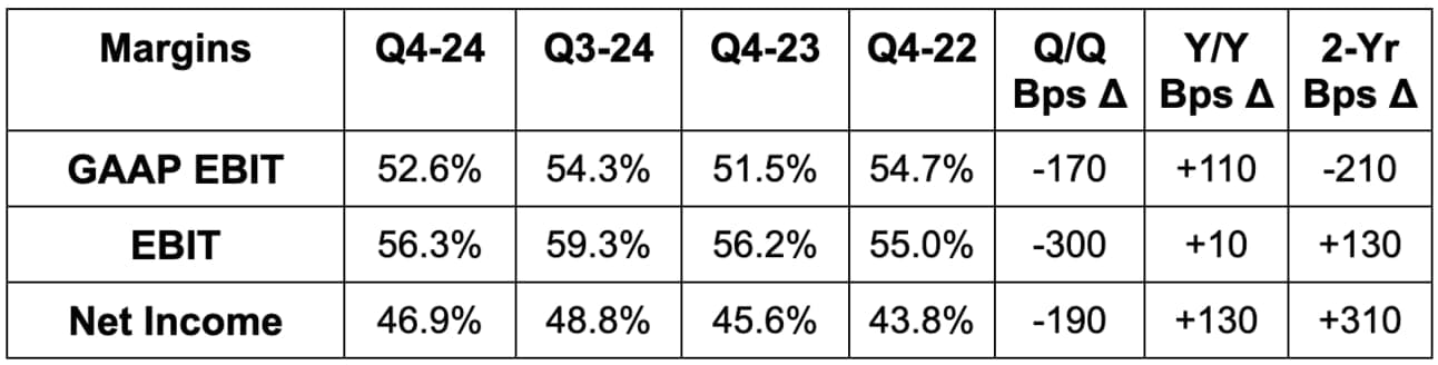 - Beat EBIT estimate by 2.5%. OpEx growth of 11% Y/Y came in at the high end of its guidance range, but the revenue outperformance still enabled the beat.