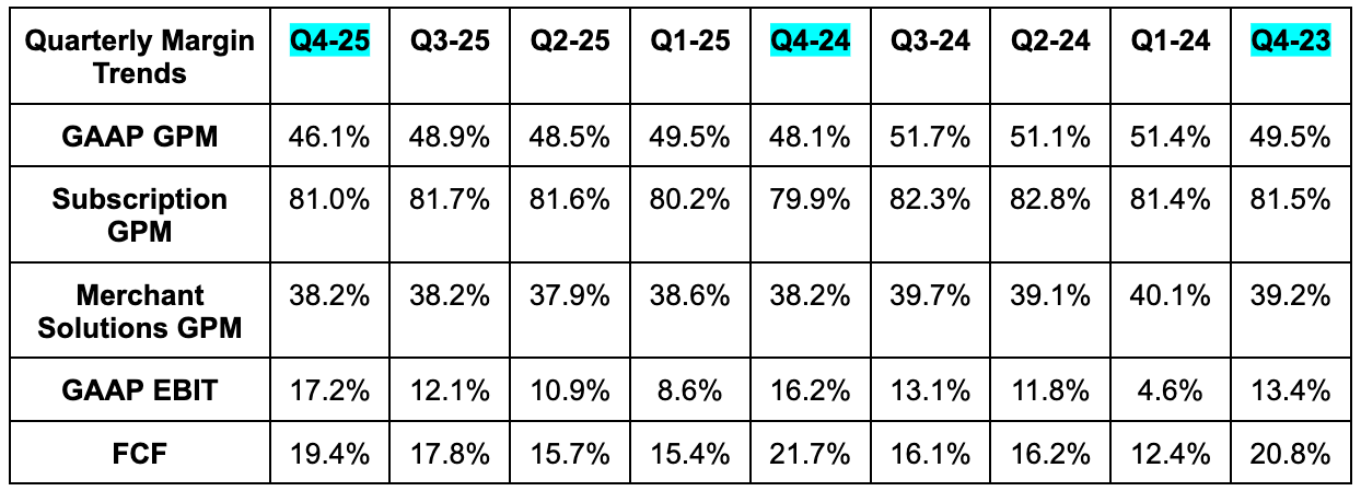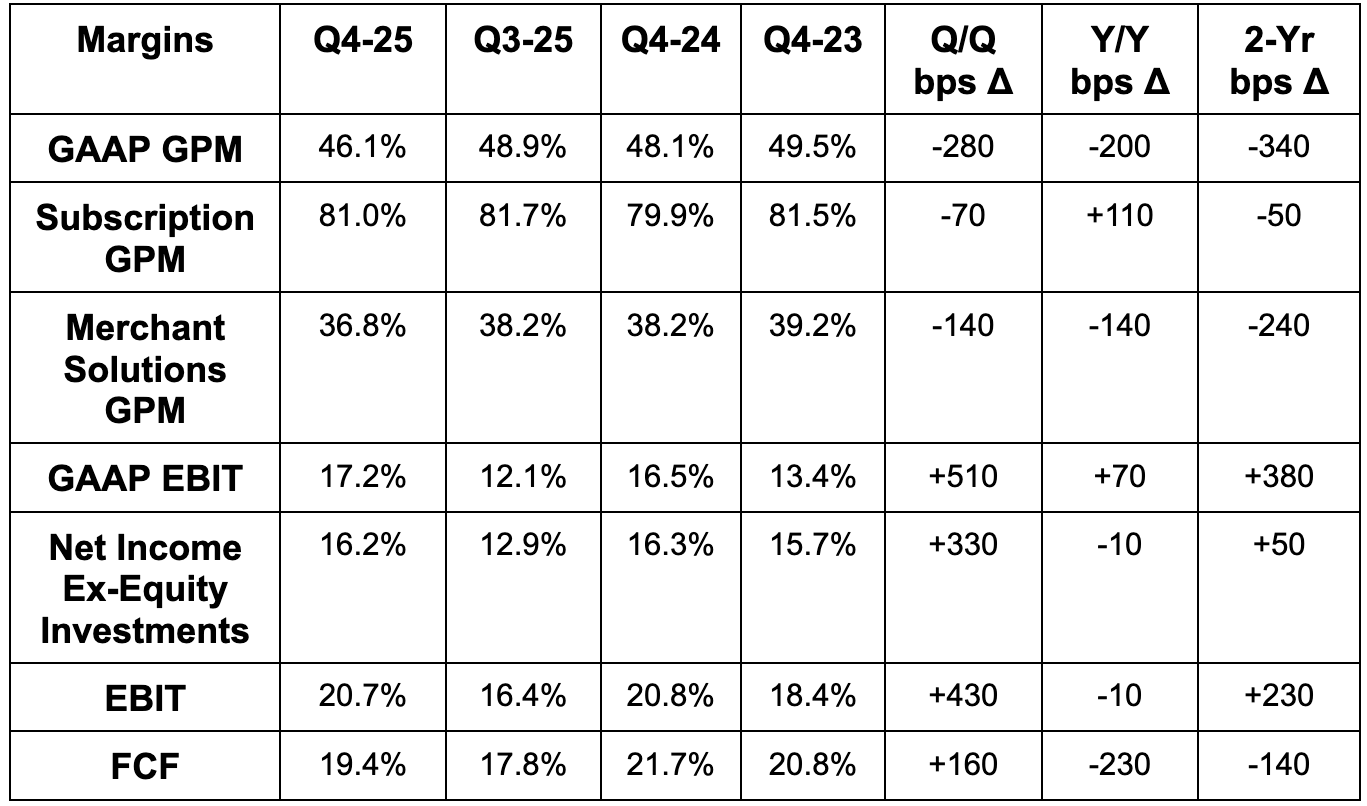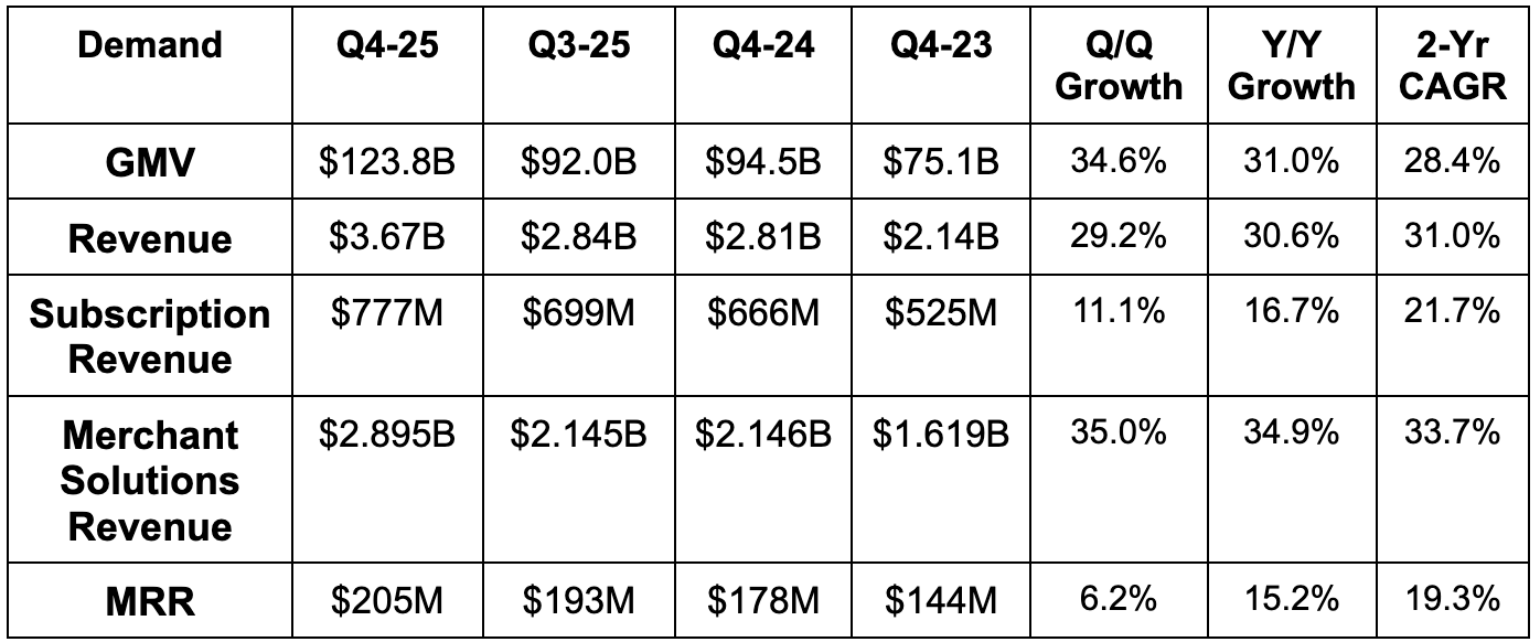 For Q1, its “low-thirties” revenue growth guidance beat 25% growth estimates. If we assume this range means 31% Y/Y growth, that’s 4.4% ahead of revenue expectations (in dollar terms). “High-20%” gross profit dollar growth guidance beat 23% Y/Y growth estimates, with the implied ongoing Y/Y GPM contraction driven again by faster merchant solutions growth. It also expects OpEx to be 37.5% of revenue vs. roughly 40% Y/Y.