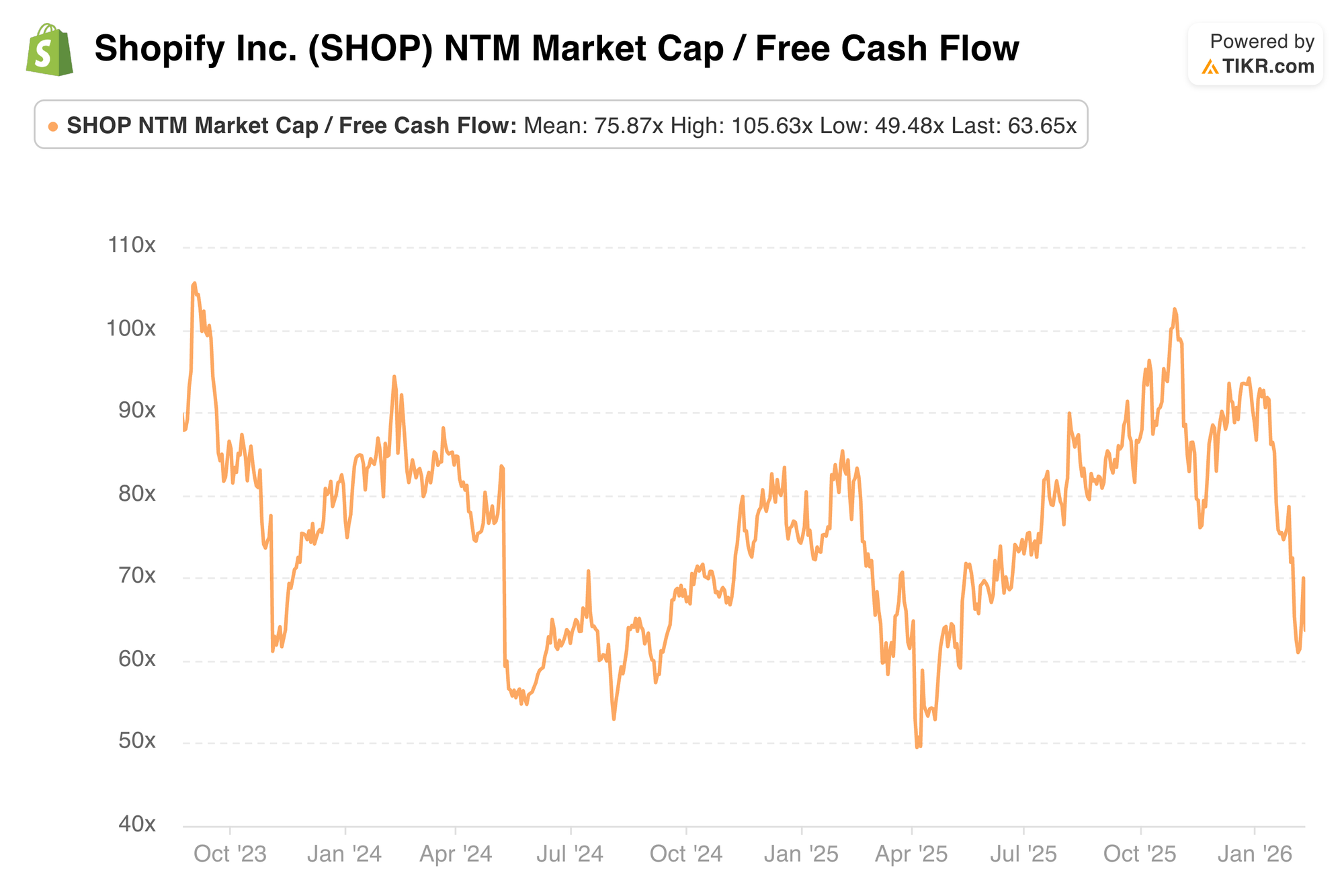 Shopify trades for 55x-60x 2026 FCF depending on where estimates end up. FCF is expected to compound at a 28% clip for the next two years.