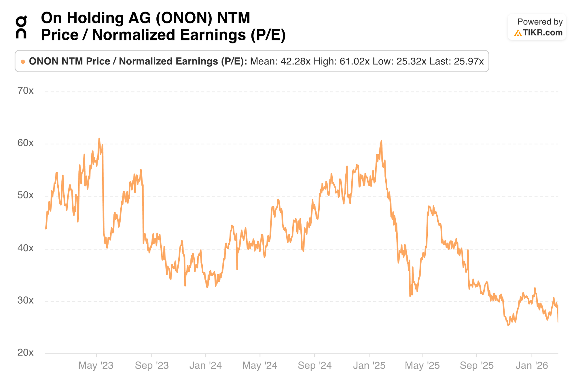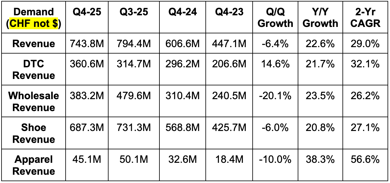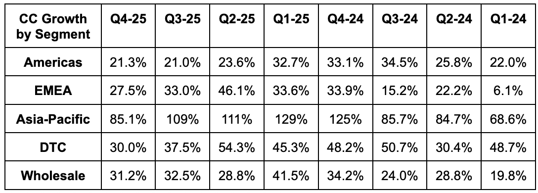 As a reminder, ONON guided to a 26%+ constant currency revenue CAGR from 2023 to 2026. The minimum revenue guidance they offered for 2026 represents a three-year CAGR of 30.5%. And if history is any indication, barring a macroeconomic collapse, they will do much better than this initial annual outlook.