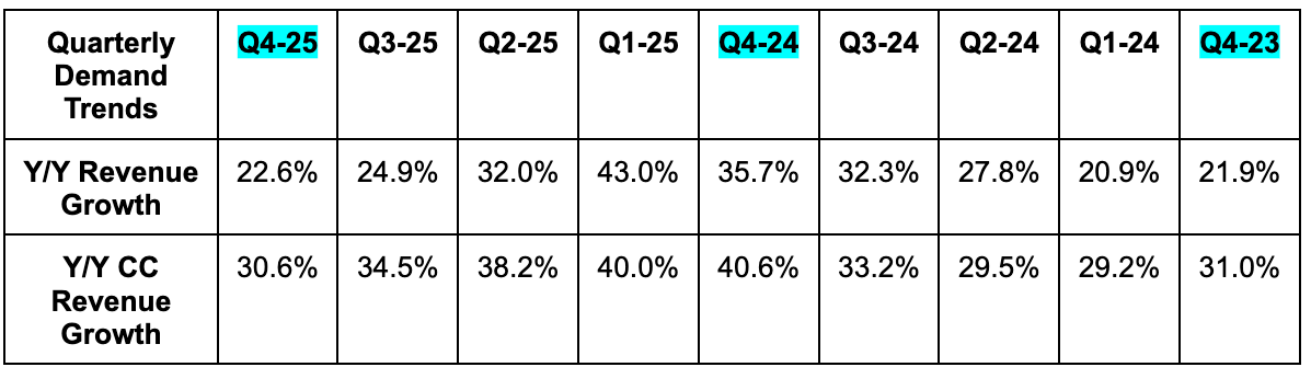 Part of the negative earnings reaction was probably related to the lack of raised constant currency growth guidance for 2026. They had already given investors 23%+ for 2026 during the Q3 call. So this was a reiteration. I think it's important to recognize they're reiterating the same growth rate, despite the 2025 base now being higher than they originally expected on the Q3 call. They were rightfully quick to point that out because it means the CC revenue dollar guide for 2026 was raised.