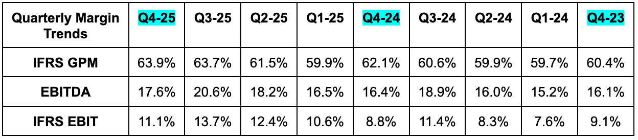 The company is already well beyond the 2026 targets it set at its 2023 investor day, which called for a 60%+ GPM and an 18%+ EBITDA margin.