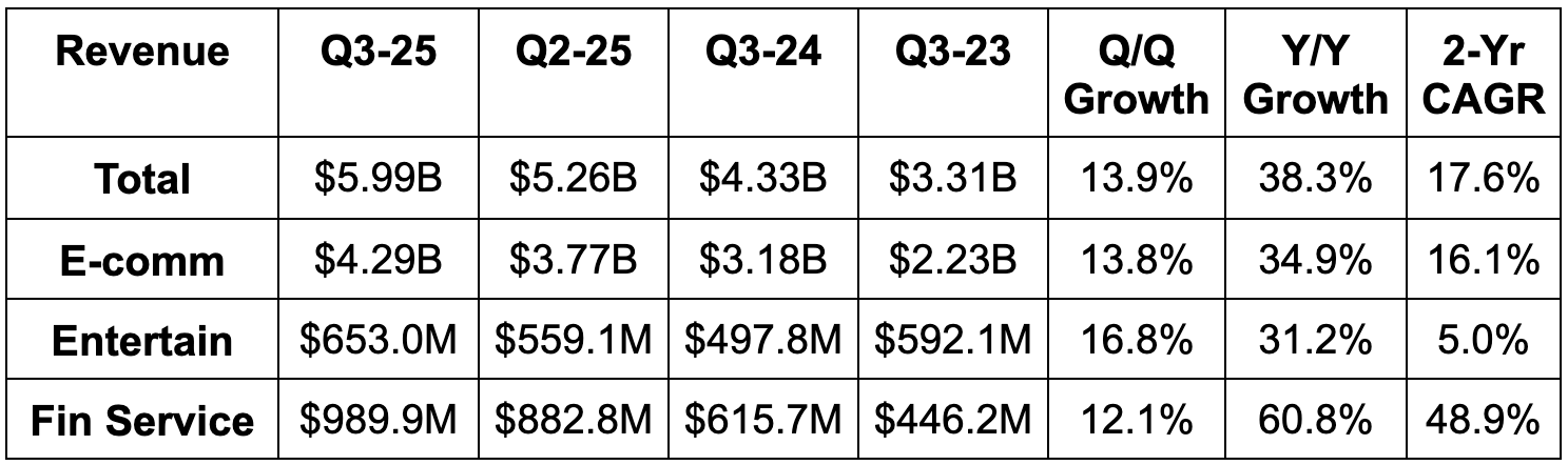 - E-commerce beat estimates by 5.7%. Within e-commerce, core marketplace revenue (transactions & ads) rose by 53% Y/Y. Value-added services revenue (logistics) fell 6% Y/Y.