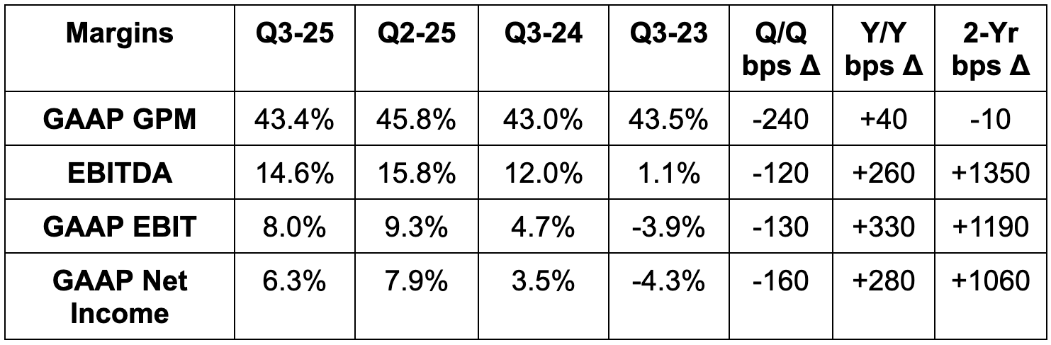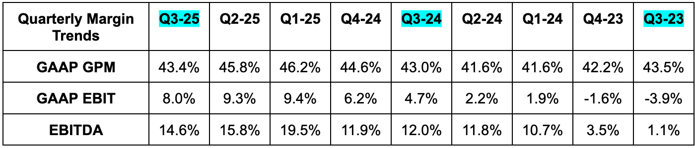 - Missed 45.7% GPM estimates by 230 basis points (bps; 1 basis point = 0.01%).
