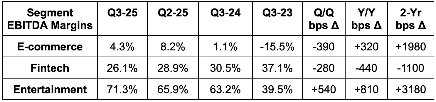 SE still expects e-commerce GMV growth to surpass 25% Y/Y this year. It also reiterated 30%+ entertainment bookings growth for 2025. They remain confident in Y/Y EBITDA margin expansion, which was great to hear amid intensifying Brazil competition as MELI lowers free shipping minimums and SE pushes its own customer service forward. Notably, these investments from SE will be a much less severe margin headwind than previous CapEx cycles.