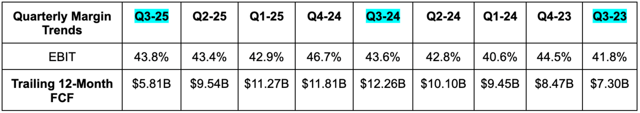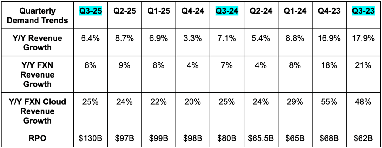 For next quarter, it expects 9% Y/Y revenue growth, which missed roughly 9.5% Y/Y growth estimates. Sales estimates for FY 2025 fell by 1% after this report. It also expects 26% Y/Y cloud growth and $1.63 in EPS, which missed estimates by $0.15. The EPS miss led to estimates falling for FY 2025by 2.5%. For FY 2025, it reiterated 50% Y/Y cloud growth.