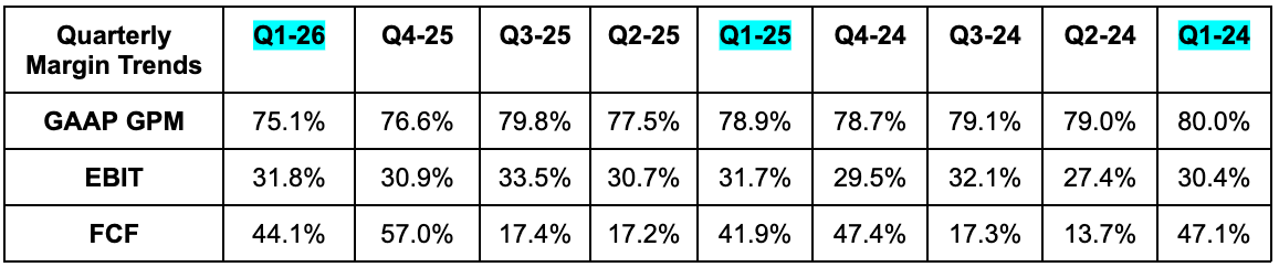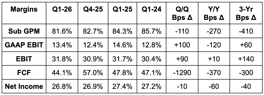 - Missed 82.5% subscription GPM estimates by 90 basis points (bps; 1 basis point = 0.01%).