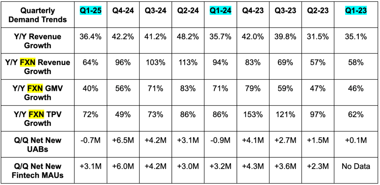 - Beat total payment volume (TPV) estimate by 11%; crushed FX neutral growth estimate.