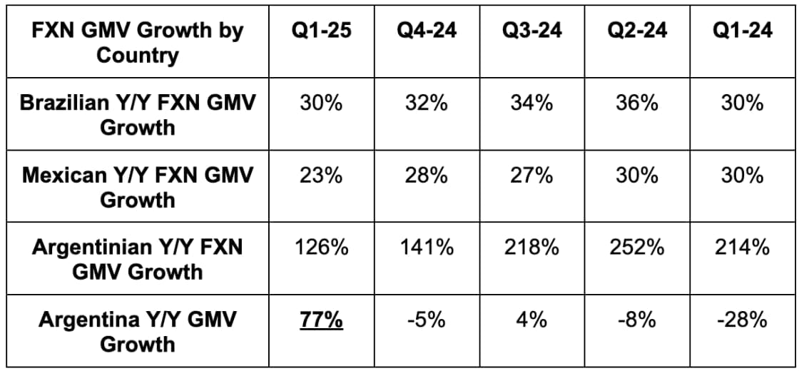 A category of technology sales in Mexico held back growth there to a modest degree. MELI was more than capable of overcoming this headwind elsewhere, but this still bothered them (as it would any good team). Competition cut prices and added generous financing terms and MELI also just didn’t have the assortment it needed. They’re fixing this with “several targeted initiatives” and are already seeing trends improve. Excluding this category, the 23% FXN volume growth in Mexico would have been around 30% Y/Y.