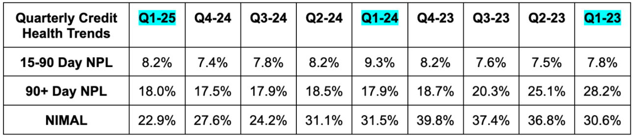 Definition: Net Interest Margin After losses (NIMAL) measures credit revenue - credit provisions - funding costs. It’s similar to NU’s risk-adjusted net interest margin (NIM). Higher is better. 15-90 day non-performing loan rate measures the proportion of loans 15-90 days past due. Lower is better.