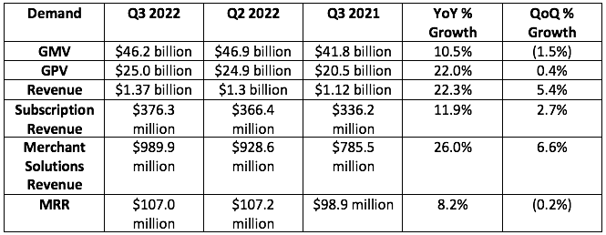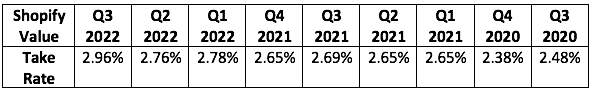 - As a reminder, in Q1 2022, Shopify changed its developer revenue take rate from a flat fee of 20% to 0% on the first $1 million and 15% thereafter. This will continue to hit subscription growth through the first quarter of next year. It’s around a 400 basis point growth headwind today. Also in Q1 2022, Shopify began recognizing theme (design) sales on a net (not gross) basis which will weigh on growth through Q4 2022.