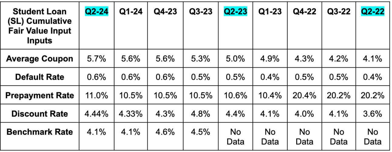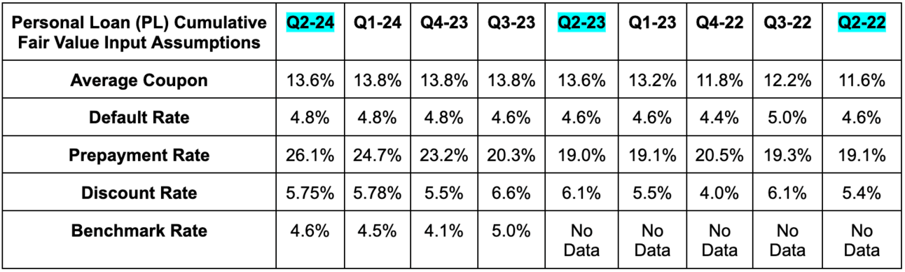 Beyond this, the other inputs baked into fair value (the leftmost columns in the first two charts), are based on observed market conditions, not random ideology. For example, in Q4 2023, falling benchmark rates like the 2-year treasury swap drove down the discount rate and credit spreads tightened as markets looked ahead to easier Fed policy. Rising default rates (which it internally observed) partially offset these tailwinds, but not entirely. So? Cumulative fair value rose and markings did too. The opposite was true from Q4 2023 to Q1 2024, so cumulative fair value fell. SoFi told us last quarter that fair value peaked for the cycle, so there will not be any noise surrounding rising premiums propping up earnings for the next several quarters.