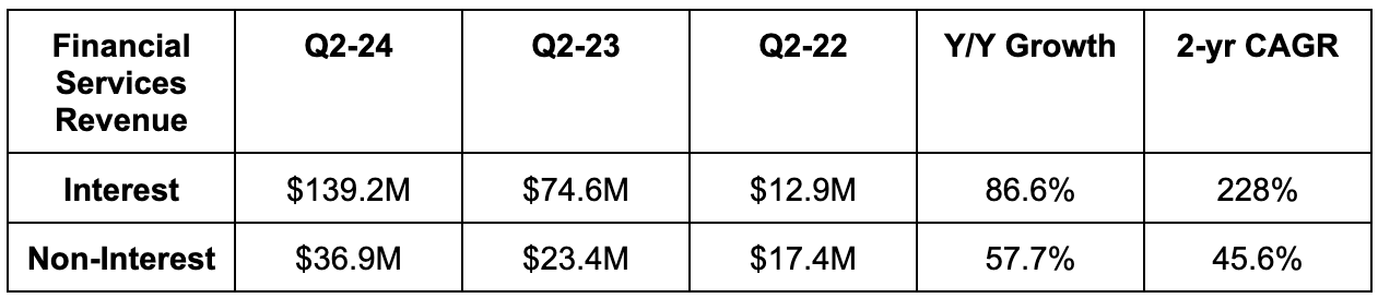 There are two pieces of financial service revenue, just like for lending: interest income and non-interest income. The former has a more transitory growth engine than the latter. Interest income directly benefits from the same balance sheet optimization process that aids lending revenue opportunities and profit spreads. Not all of SoFi’s deposits and liquidity are being used for lending. Anything unused is a prime candidate for shifting into higher yielding assets, while it pays a lower rate on those assets to depositors vs. warehouse creditors. The effect is financial services revenue growth greatly leading product and member growth for the last couple of years.