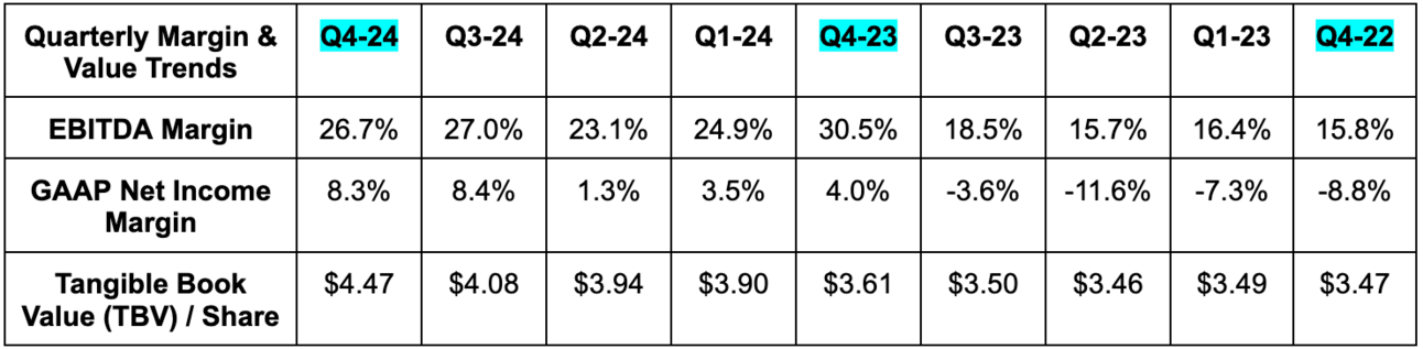 - Beat $4.04 tangible book value per share estimates by $0.43 or 10.6%.