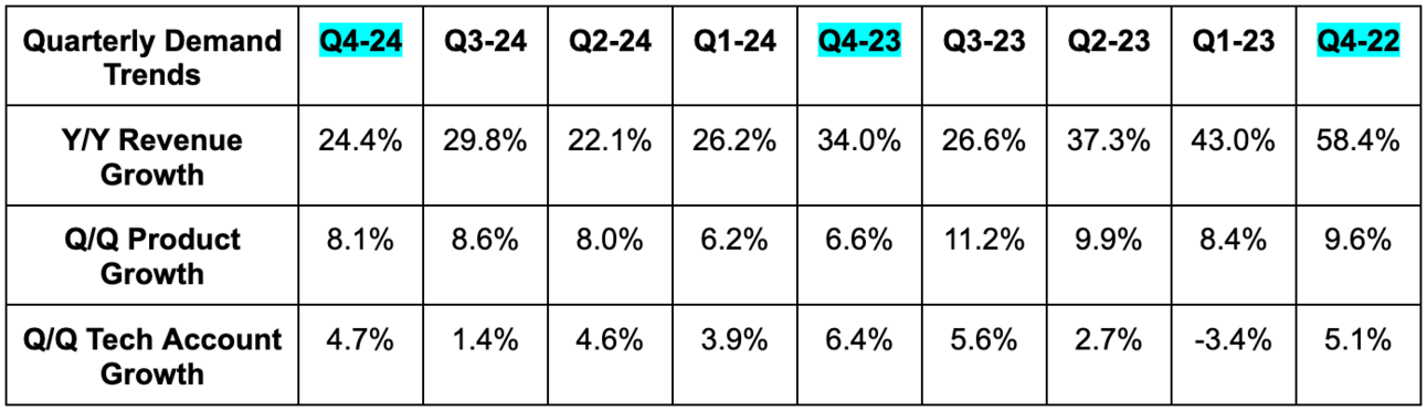 - Tech revenue disappoints… but tech account growth again outperforms, which hints at brightening future results.