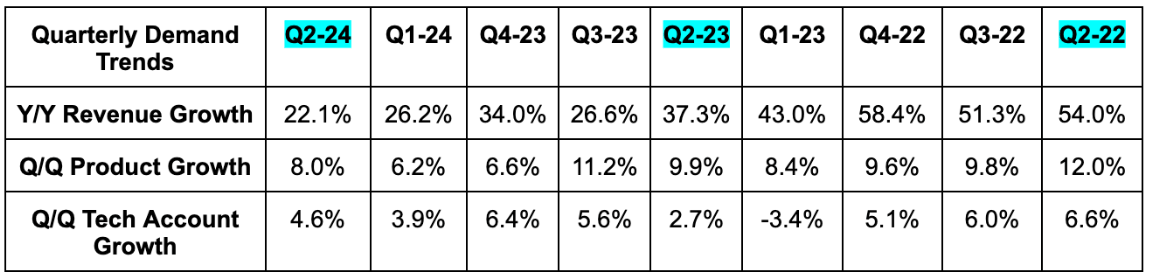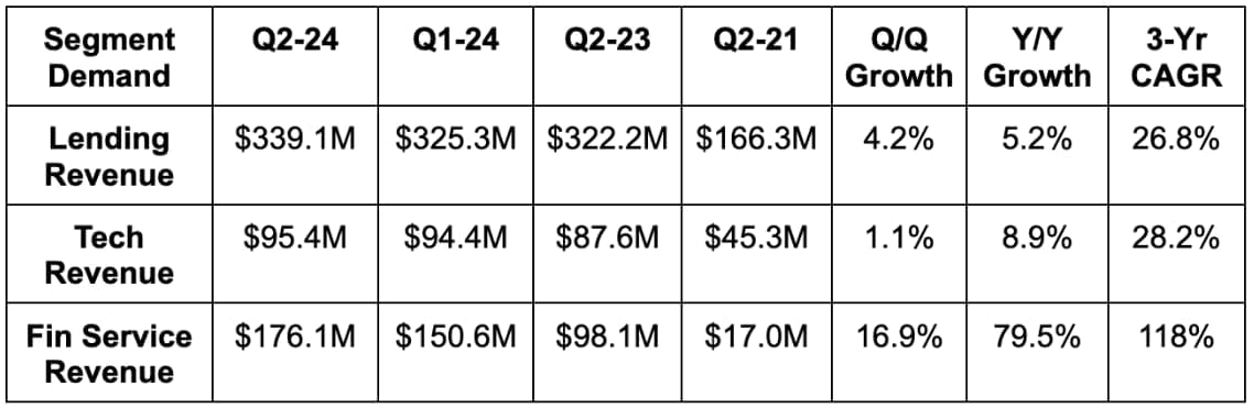 - Now sees 80%+ financial services growth vs. 75% previously. Now sees about 17% Y/Y tech platform growth vs. 20% previously.