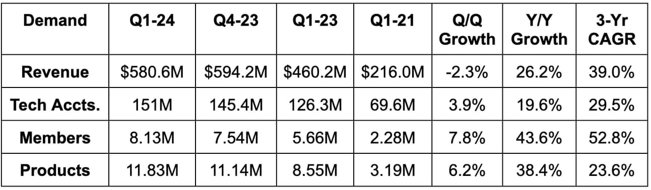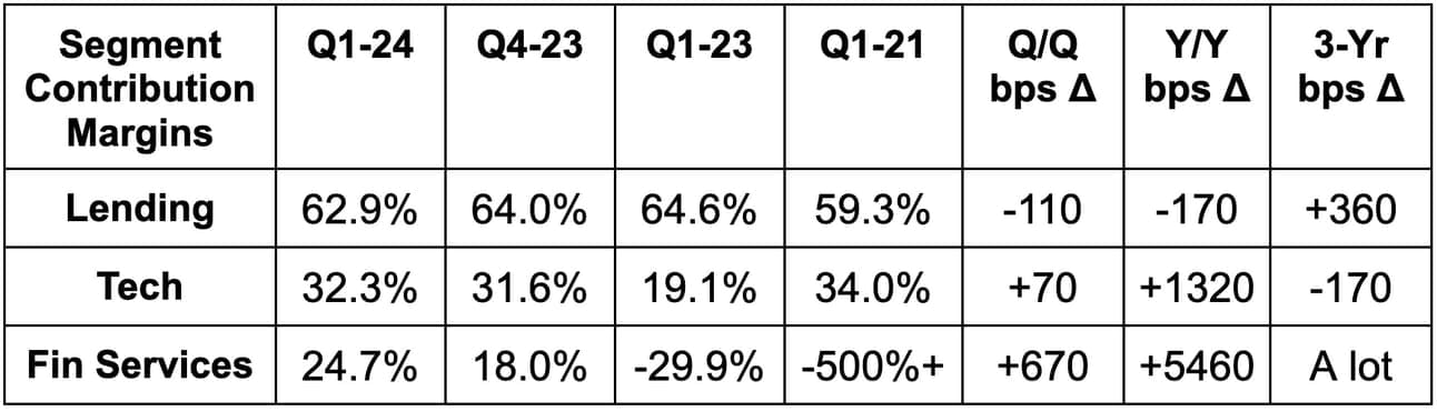 SoFi slightly raised its implied revenue guidance, which beat estimates by 1.3%. This still assumes -6.5% Y/Y lending growth and 20% Y/Y tech platform growth. That means the raise is coming from financial services. The capital market deals led to its tangible book value guidance rising from +$400 million Y/Y to +$900 million Y/Y. It reiterated adding at least 2.3 million members in 2024 for 30%+ growth.