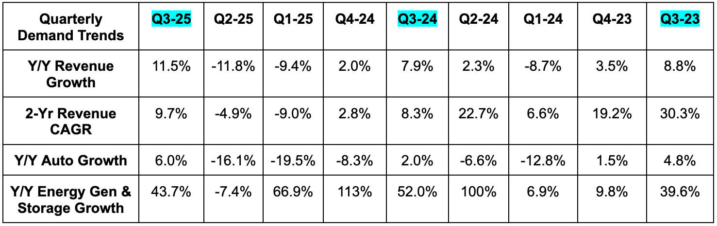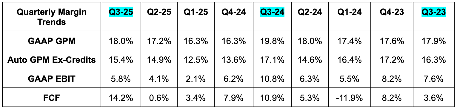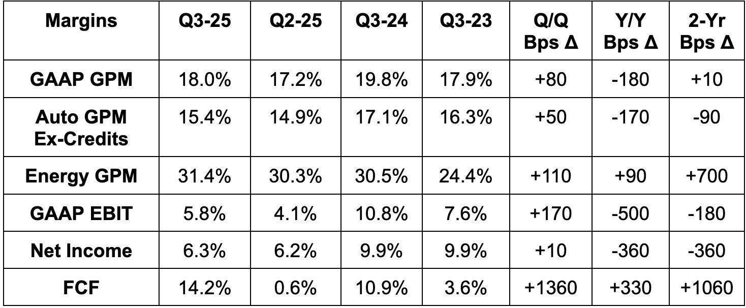 Lower regulatory credits Y/Y and lapping higher full self-driving (FSD) revenue recognition were both revenue headwinds. The FSD factor is related to last year’s Cybertruck FSD release and popular feature debuts like “Actually Smart Summon.” As Tesla reaches product milestones, it recognizes deferred revenue from previous FSD payments as revenue. It reached an abnormal number of milestones last year, leading to the tough comp.