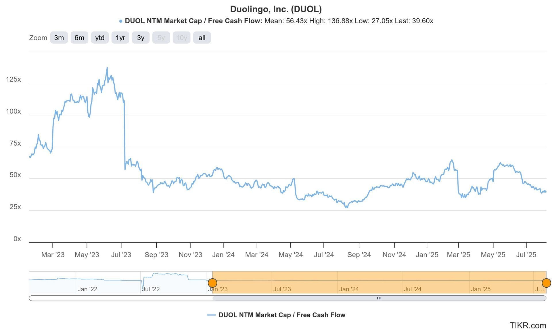 Duolingo trades for 40x forward FCF & 58x forward EPS. FCF is expected to compound at a 38% clip for the next two years. It also trades for 55x forward EPS. EPS is expected to compound at a 40% clip for the next two years.