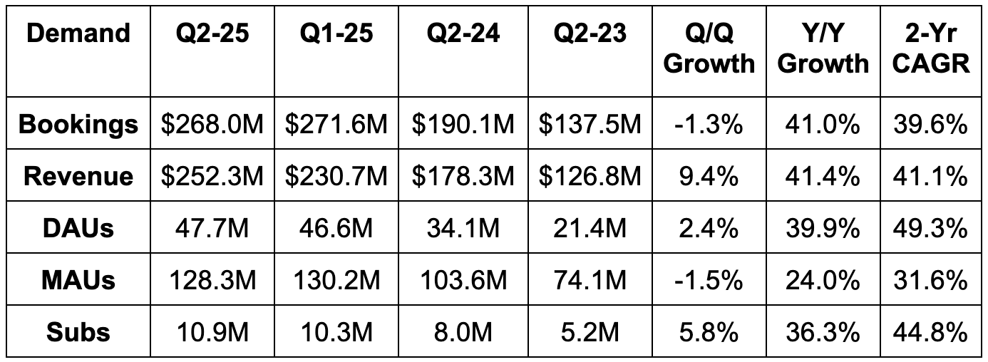 As many of you know, there was considerable mid-quarter noise regarding Duolingo. Their talented co-founder/CEO Luis von Ahn excitedly took to social media to share Duolingo’s plans on being an AI-first company. This was very well received internally, but led to considerable user backlash against the company and souring social media sentiment. Per von Ahn, he just did not word things very well, and led people to assume AI would replace their workforce, rather than supporting it. Some took to social media to announce their product boycotts and this is what led to DAU growth coming in modestly below expectations. This was specific to the USA, which is why weakness was specific to that single market.