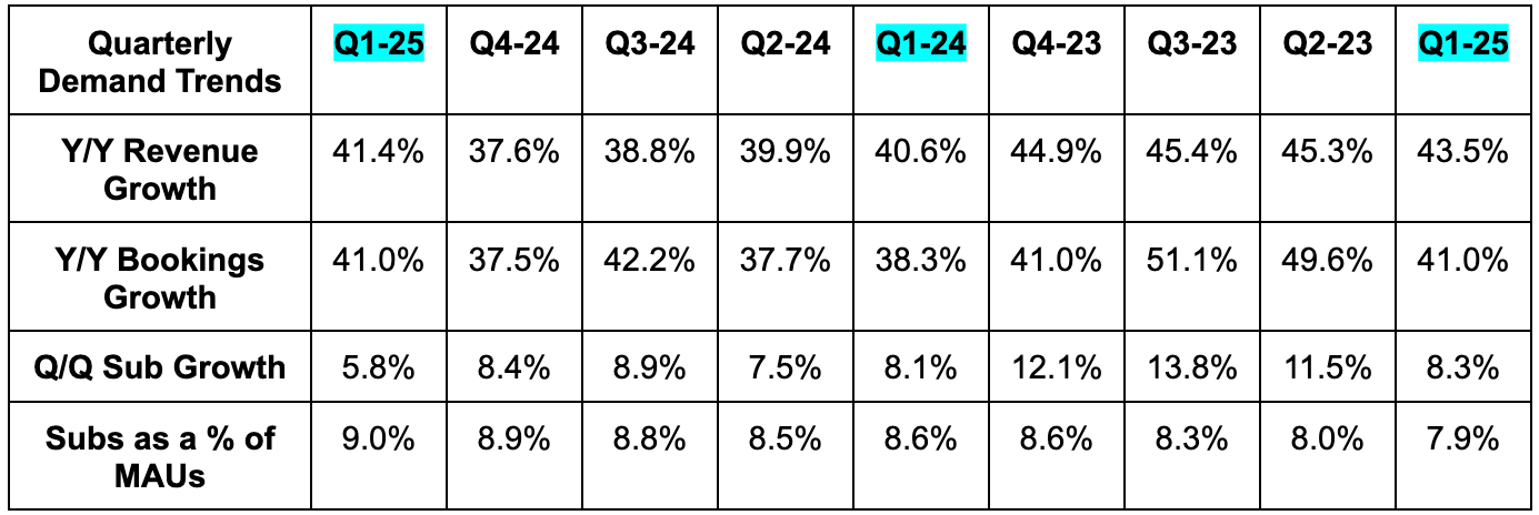 - Foreign exchange helped power some of the beat. Still, constant currency (CC) bookings growth was 39% vs. 30% growth guidance.