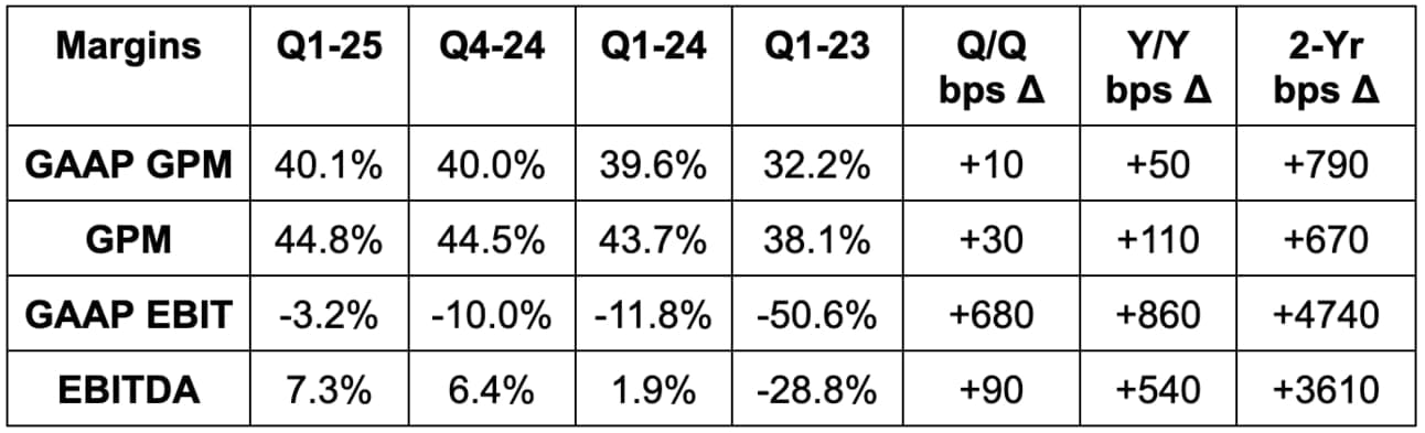 - Beat gross margin estimates by 50 bps (basis points; 1 basis point = 0.01%).